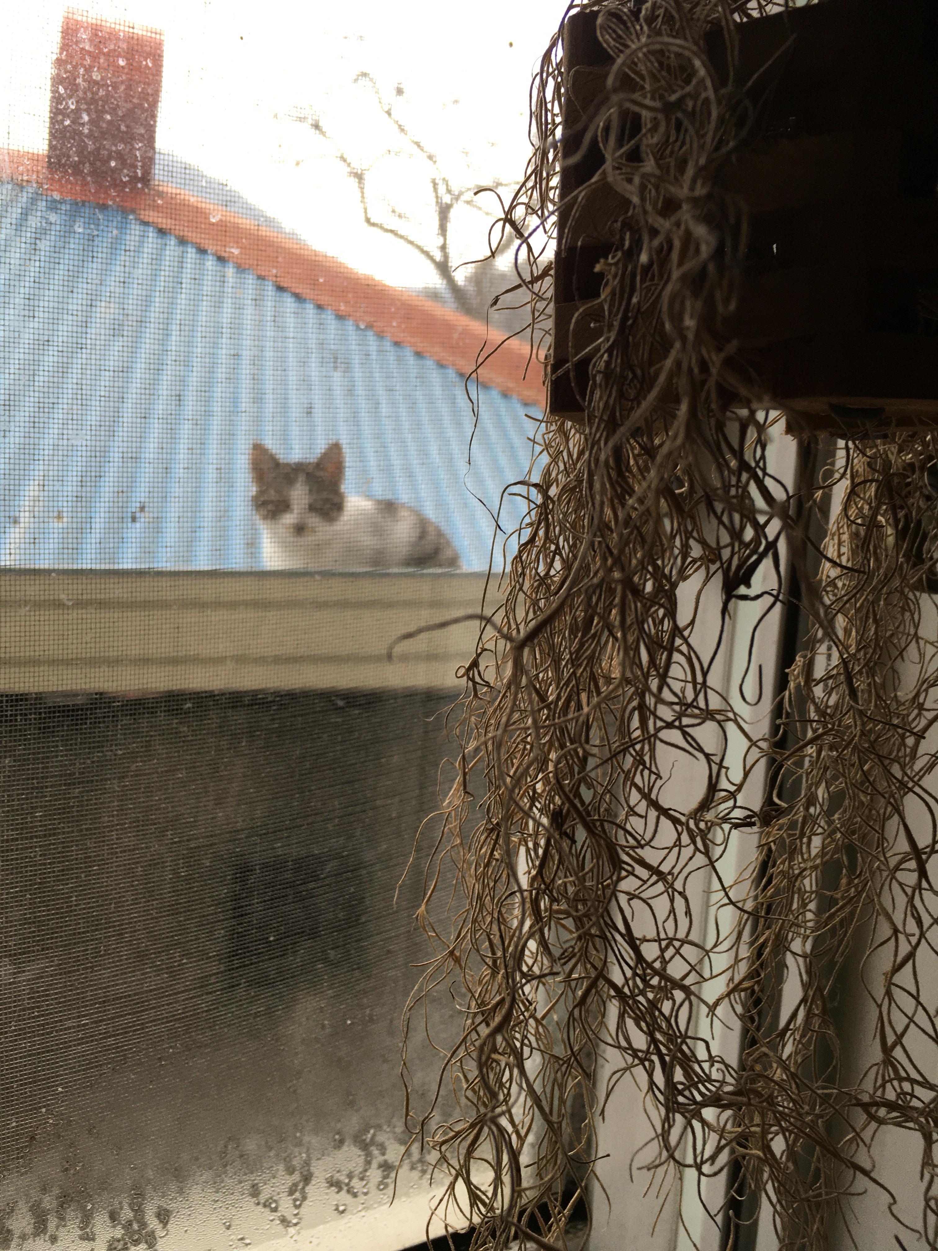 그러던 어느 날, 늦은 밤 '퍽'하는 소리에 놀라 바라본 창문에는 '삼색' 뽀시래기가 방충망에 대롱대롱 매달려 있었다. 아무래도 지붕에서 창문을 통해 집안으로 침입하려고 점프를 시도한 것 같았다. 사실 옆집 지붕과 내 방 창문은 점프하면 충분히 들어올 수 있는 아주 가까운 거리였다.
