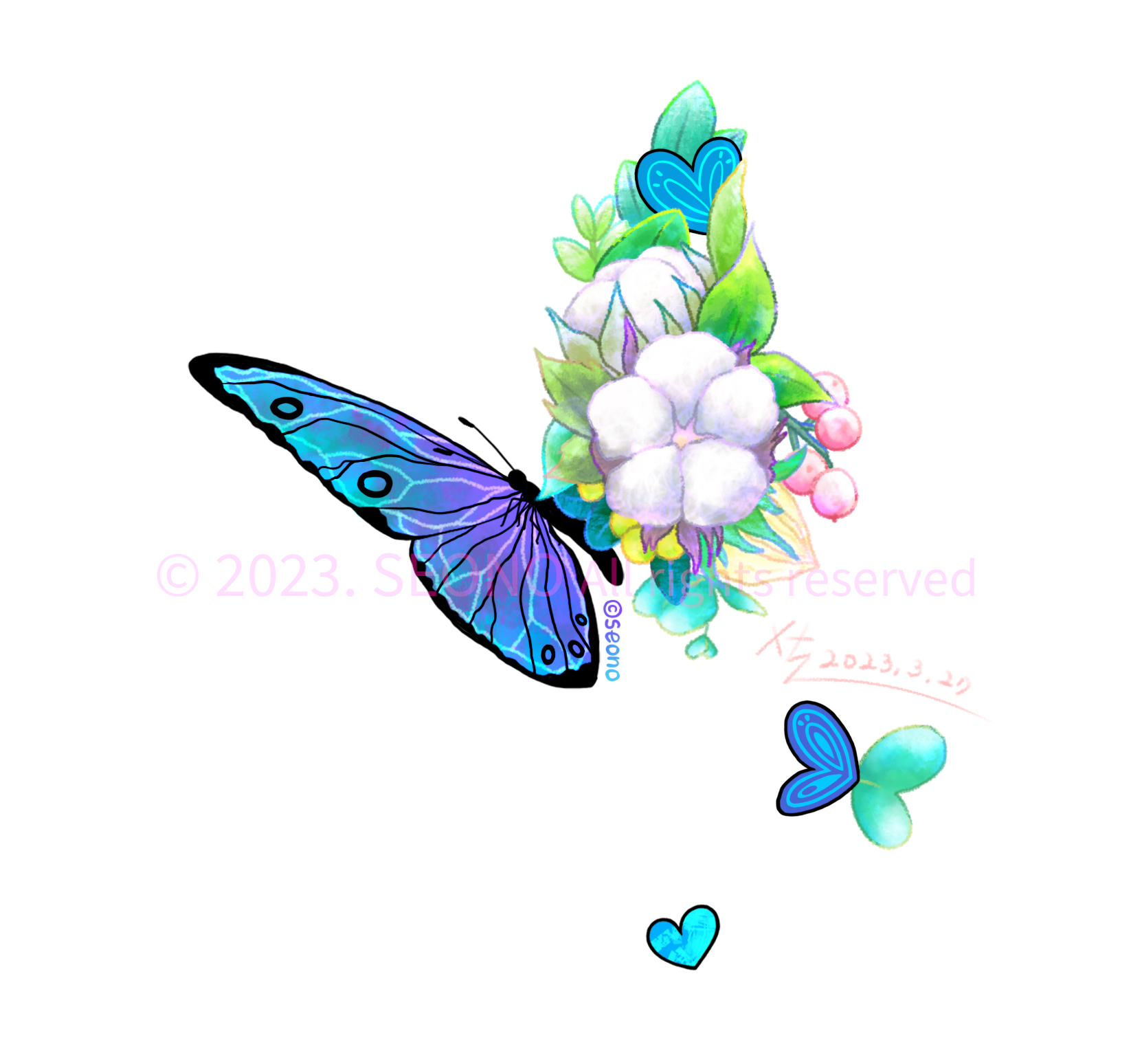 나비와 목화솜꽃다발에 빗대어 그렸다.